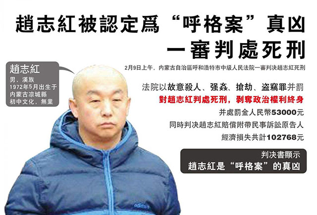 【#呼格案真凶被执行死刑#】经最高人民法院核准,今日上午,内蒙古自治区呼和浩特市中级人民法院遵照最高人民法院院长签发的执行死刑命令,对罪犯赵志红执行死刑。检察机关依法派员临场监督。 最高人民法院经复核确认,1996年9月至2005年7月间,被告人赵志红在内蒙古自治区呼和浩特市、乌兰察布市等地,连续实施故意杀人、强奸、抢劫、盗窃犯罪共计17起,共杀死6人,强行奸淫幼女2人、妇女10人,还多次抢劫、盗窃,犯罪性质特别恶劣,手段残忍,社会危害极大,后果和罪行极其严重。赵志红还系累犯,依法应从重处罚。赵志红虽能如实供述自己的罪行,但根据其犯罪的事实、性质、情节和对社会的危害程度,依法不足以从轻处罚。近日,最高人民法院作出裁定,核准内蒙古自治区高级人民法院维持第一审对被告人赵志红以故意杀人罪判处死刑,剥夺政治权利终身;以强奸罪判处死刑,剥夺政治权利终身;以抢劫罪判处有期徒刑十五年,并处罚金人民币五万元;以盗窃罪判处有期徒刑一年,并处罚金人民币三千元,决定执行死刑,剥夺政治权利终身,并处罚金人民币五万三千元的刑事裁定。 呼和浩特市中级人民法院向赵志红宣告并送达了最高人民法院的刑事裁定书。临刑前